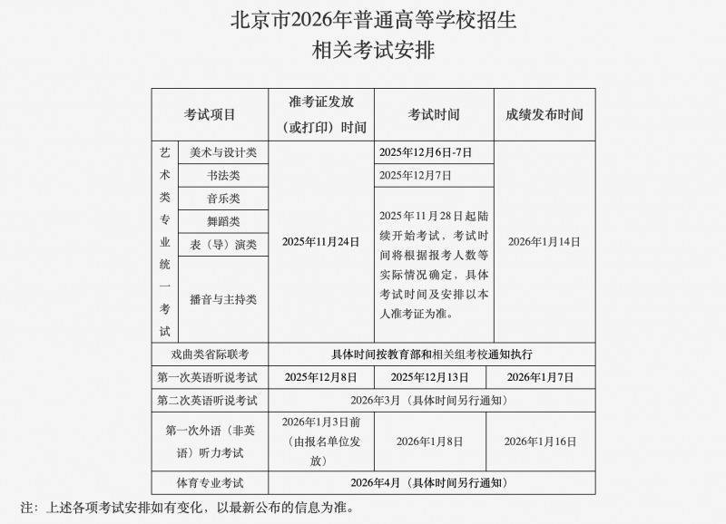 r2026年普通高等学校招生艺术类专业统一考试、体育专业考试、英语听说考试、外语(非英语)听力考试报名与高考报名同期进行。